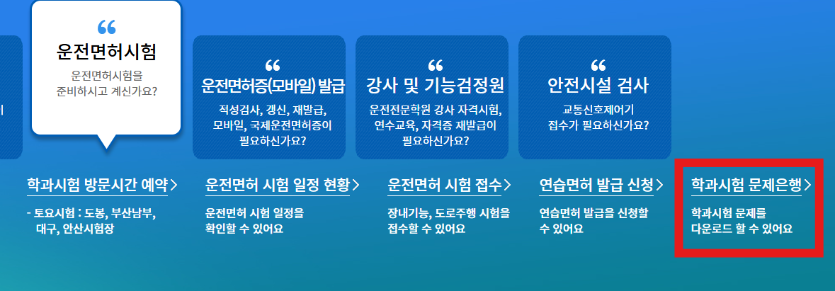 - "운전면허 서비스" → "학과시험 문제은행" 클릭