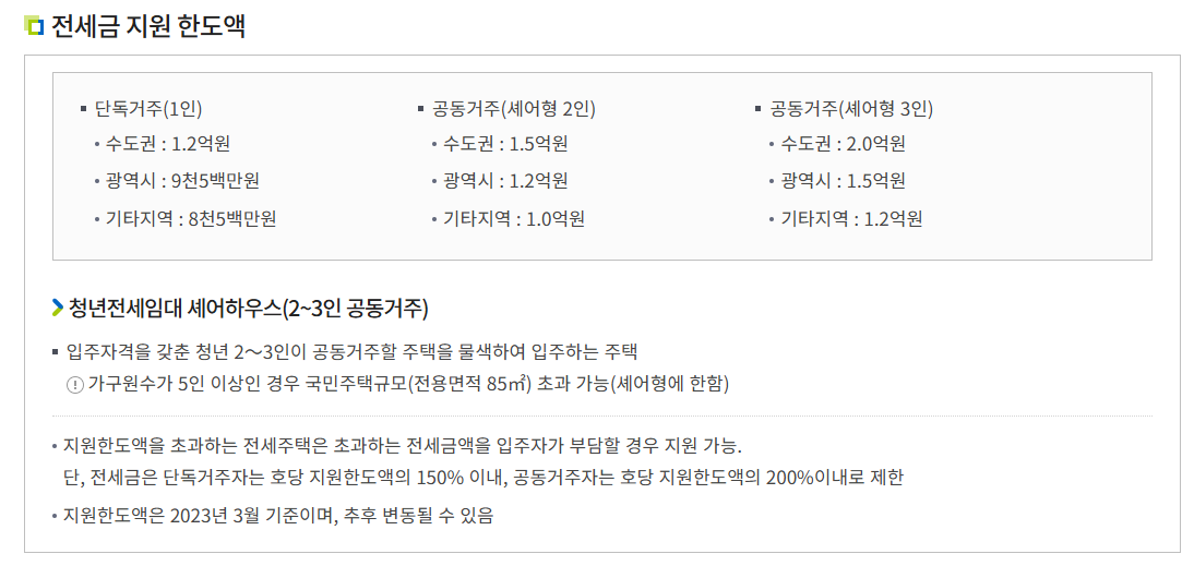 지원 한도액을 초과하는 주택의 경우, 초과하는 전세금액을 입주자가 부담할 경우 지원이 가능합니다. 단, 전세금은 단독 거주자는 호당 지원한도액의 150% 이내, 공동거주자는 호당 지원한도액