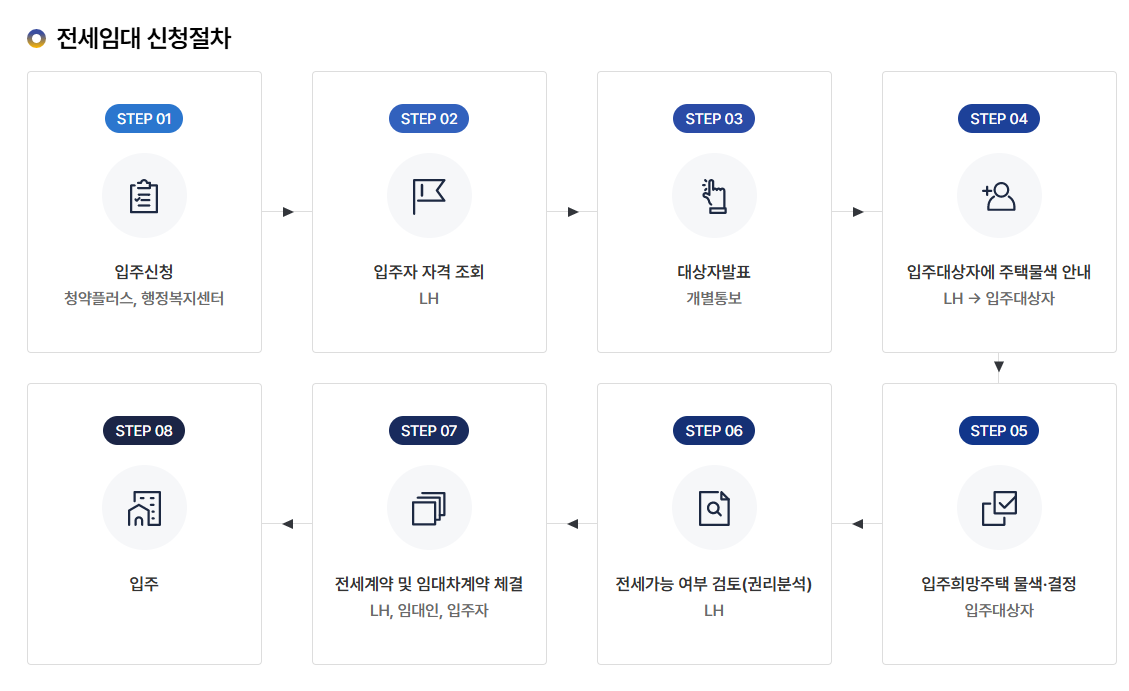 - 계약 체결: LH가 주택 소유자와 전세계약을 체결하고, 입주자는 LH와 임대차 계약을 맺습니다.