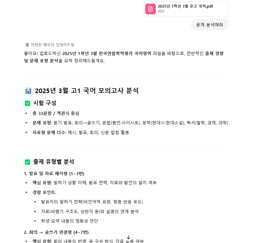 예를 들어 “2023년 고1 국어 기말고사 분석해줘”라고 입력하면,