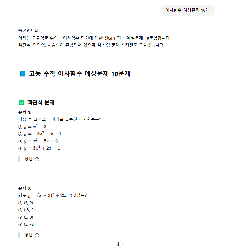 “중3 수학 피타고라스 정리 예상문제 만들어줘”라고 하면 시험 스타일에 맞는 문제가 나와요.