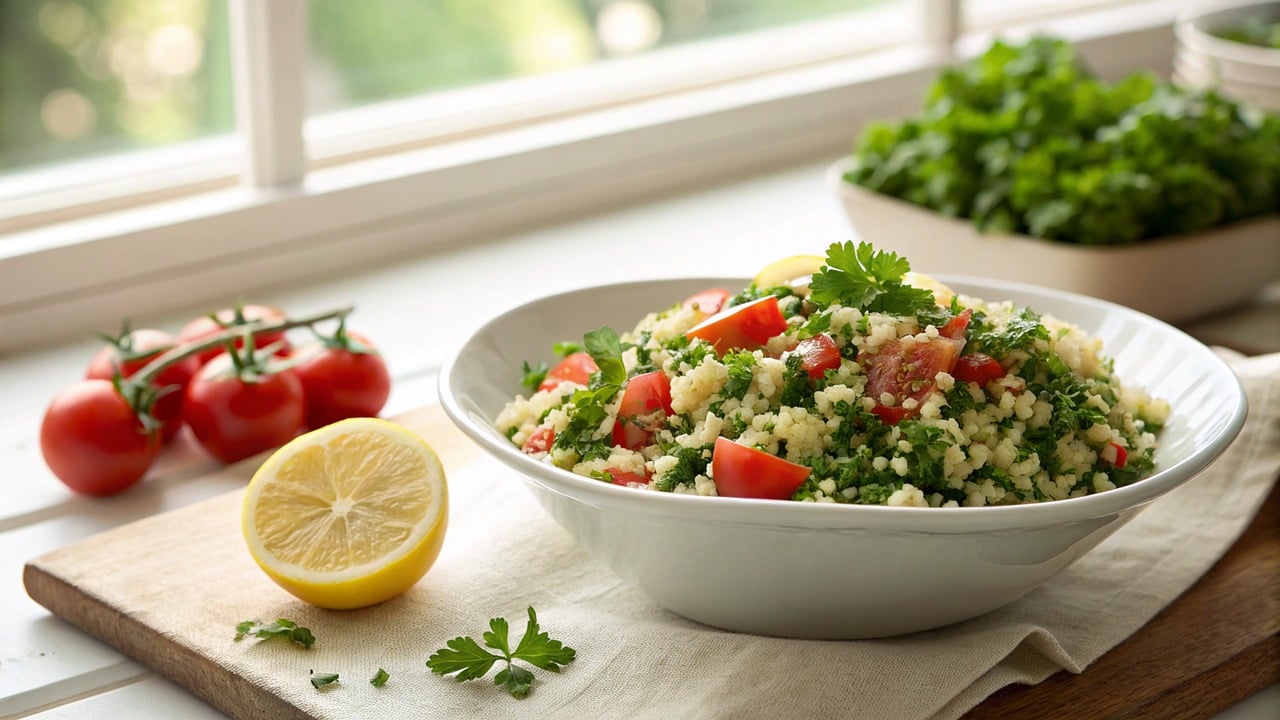 쿠스쿠스 1컵, 뜨거운 물 1컵, 방울토마토 10개, 오이 1/2개, 적양파 1/4개, 다진 파슬리,