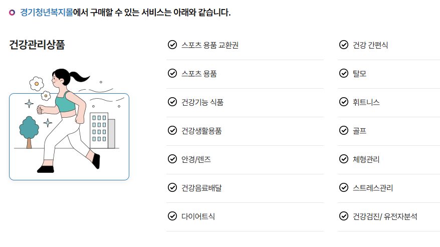 지급된 포인트는 '경기청년복지몰'에서 사용 가능하며, 다양한 생활·문화·건강 관련 물품을 구입할 수 있어 실질적인 복지 혜택을 제공합니다.