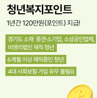 경기도 청년복지포인트는 도내 중소기업 및 비영리 법인 등에 재직 중인 청년에게 연 최대 120만 원 상당의 포인트를 지급하는 사업이에요.