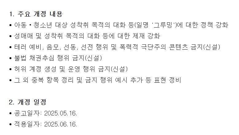 | 개정 내용 | 아동 성착취 유인, 테러 홍보 등 행위 제재 강화 |