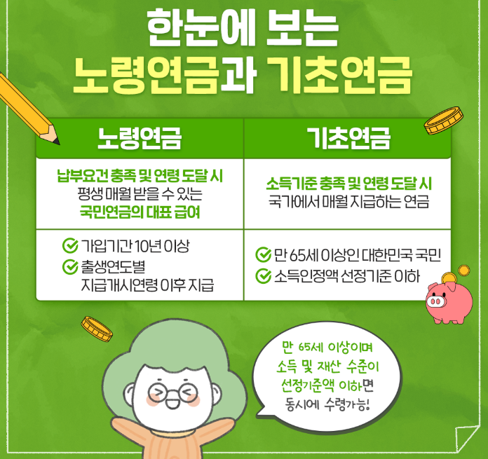 기초연금과 노령연금은 이름은 비슷하지만 대상, 성격, 수급 기준이 전혀 다른 제도입니다. 하지만 이 둘은 조건만 맞으면 동시에 받을 수 있으며, 노후 생활에 큰 도움이 되는 두 축이 될 수 있습니다.