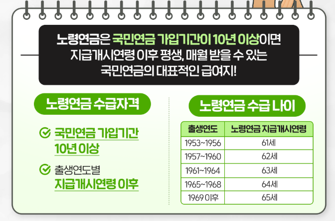 노령연금은 국민연금에 가입해 일정 기간 이상 납부한 사람에게 지급되는 공적 연금입니다. 최소 10년 이상 납부하고, 출생연도에 따라 정해진 수급 개시 연령에 도달해야 받을 수 있습니다. 예를 들어 1960년생은 만 63세, 1969년생 이후는 만 65세부터 수급이 시작됩니다.