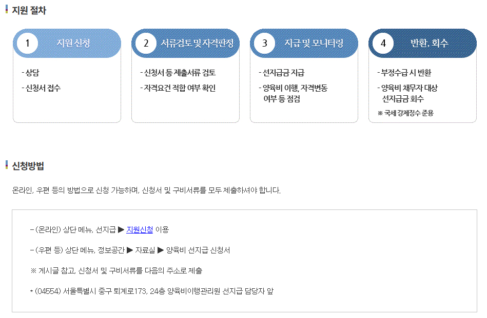 양육비이행관리원이 주관하여 접수 및 지원을 담당합니다.