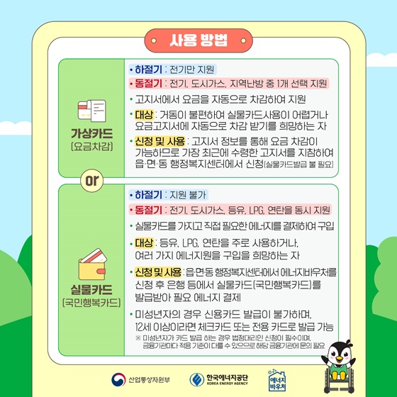 에너지바우처는 가상카드(요금 차감) 또는 실물카드(국민행복카드) 방식으로 지원됩니다.