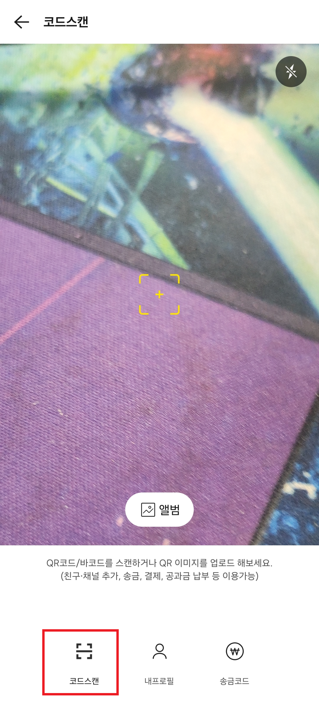 - QR 스캔 화면이 나타나면, 하단의 '앨범' 아이콘을 눌러요.
