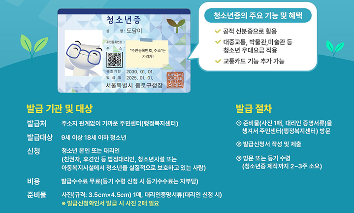 청소년증은 주민등록증이 없는 청소년이 병원, 시험장, 도서관, 관공서 등에서 본인 확인이 필요할 때 사용할 수 있도록 마련된 제도입니다. 이 외에도 박물관, 미술관, 유원지, 공연장, 영화관, 지하철, 기차 등에서 청소년 할인 혜택을 적용받을 수 있어 실생활에서도 큰 장점이 있습니다.