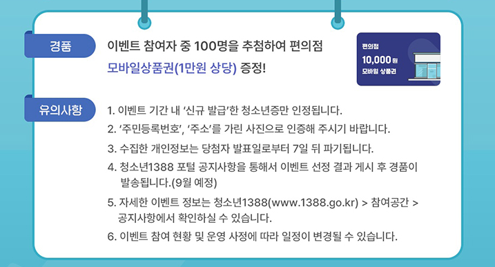 여성가족부와 청소년1388 포털에서는 청소년증 활용을 촉진하기 위해 여름방학을 맞아 인증 이벤트를 진행합니다. 2025년 7월 15일부터 8월 29일까지 청소년증을 신규 발급받은 뒤, 1388 포털에 인증 사진을 업로드하면 참여가 완료됩니다. 참여자 중 100명을 추첨해 편의점 모바일 상품권이 지급될 예정입니다.