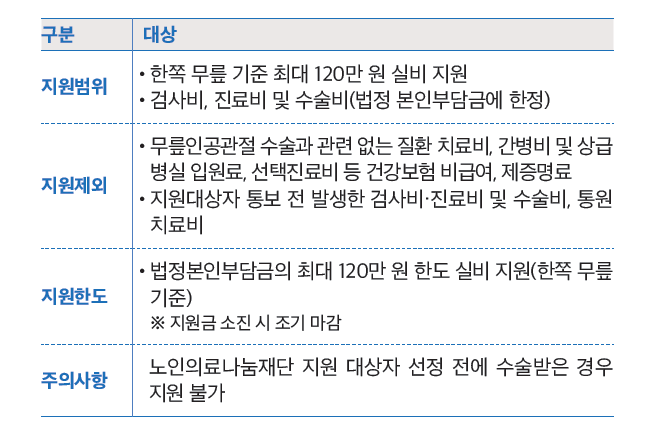 | 지원금액 | 한쪽 무릎 기준 최대 120만 원 (실비 기준) |