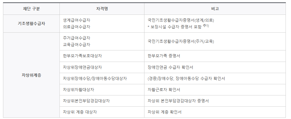 한국장학재단 기준 학자금 지원구간 산정 결과가 기초생활수급자 또는 차상위계층으로 확인된 학생만 신청할 수 있습니다. 일반 소득분위 3분위 이하 또는 중위소득 기준이 아닌, 반드시 수급자 또는 차상위계층으로 분류되어야 자격이 인정됩니다.