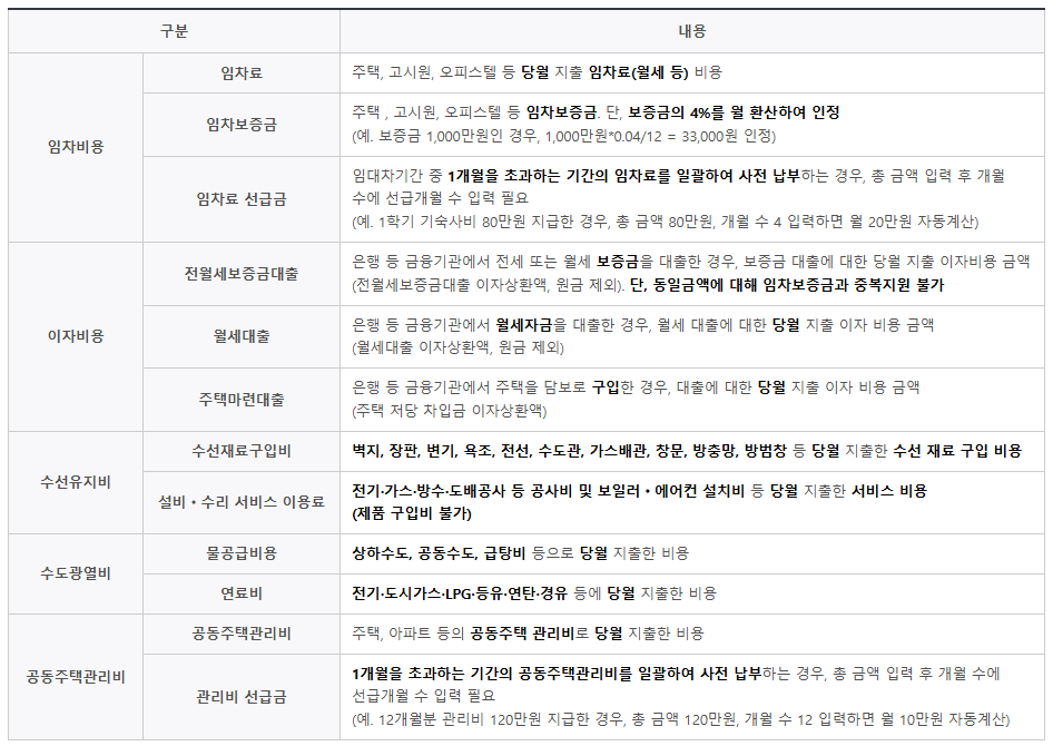 주거안정장학금은 단순한 월세 지원이 아니라, 실제 주거에 들어가는 다양한 비용을 실비 기준으로 지원합니다. 학기 중 월 최대 20만 원 한도로 다음 항목들이 지원 대상이 됩니다.
