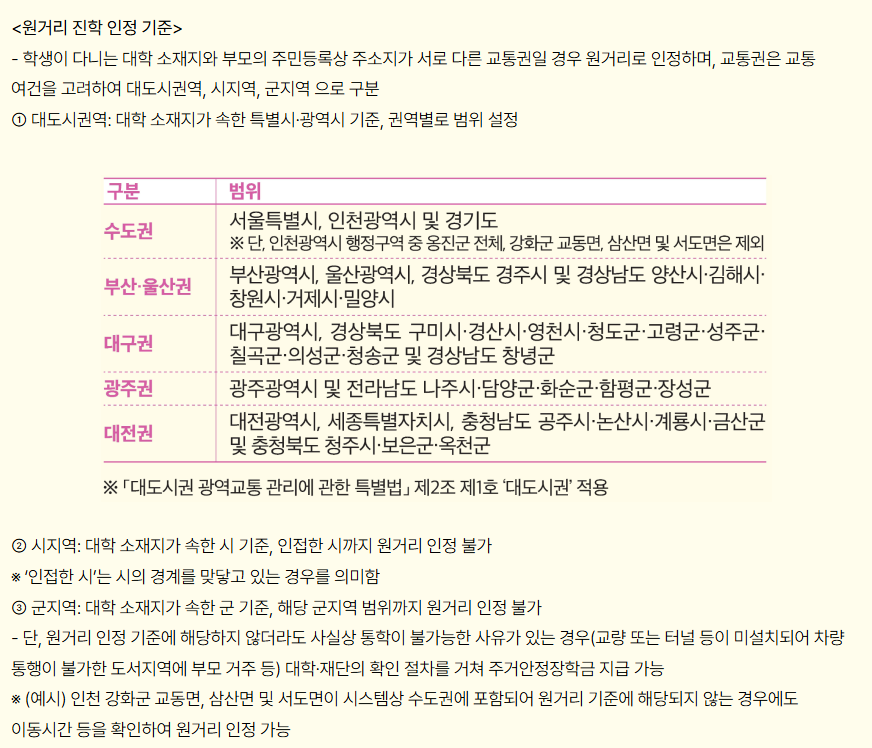 이 장학금의 핵심은 ‘원거리 통학 여부’입니다. 학생 본인의 거주지와 대학의 위치가 서로 다른 교통권에 있어야 하며, 일반적인 통학이 어렵다는 사실이 입증돼야 합니다. 부모 모두의 주민등록상 주소가 대학이 위치한 지역과 다를 경우 기본 조건을 충족하게 됩니다.