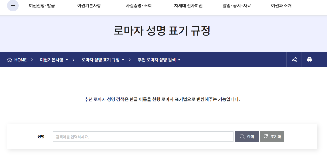 외교부 기준에 맞춘 여권용 이름 변환기로, 과거 여권 발급 시 등록된 영문 이름을 확인할 수도 있습니다.