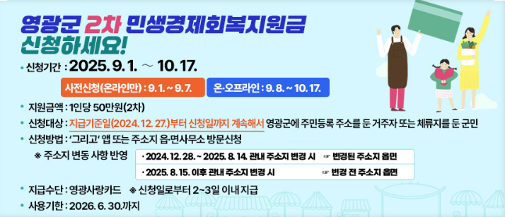 영광군은 민생경제회복지원금 2차 접수를 통해 전 군민에게 1인당 50만원을 지급해요. 접수는 9월 1일부터 10월 17일까지 진행되고, 첫 주는 온라인 전용으로 운영돼요. 지급 수단은 영광사랑카드이며, 지역 내 가맹점에서만 사용할 수 있도록 설계되었어요. 사용 기한은 2026년 6월 30일까지라 비교적 넉넉하지만, 기한을 넘기면 잔액이 소멸될 수 있으니 미리 계획을 세워두는 편이 좋아요.