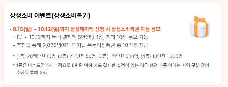 총 2천 명이 넘는 국민에게 혜택이 돌아가며, 1등 당첨자에게는 상당한 규모의 상품권이 제공됩니다. 상생페이백과 함께 참여하면 소비 혜택을 두 배로 챙길 수 있습니다.