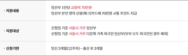 서울시는 임신과 출산을 준비하는 가정을 위해 임산부 교통비 지원사업을 운영하고 있습니다. 임산부 1인당 70만원의 교통비를 바우처 형태로 지급하여 이동 편의를 높이고 경제적 부담을 덜어주려는 제도입니다. 금액이 크고 활용 범위도 넓어 임산부라면 반드시 챙겨야 할 지원정책 중 하나입니다.