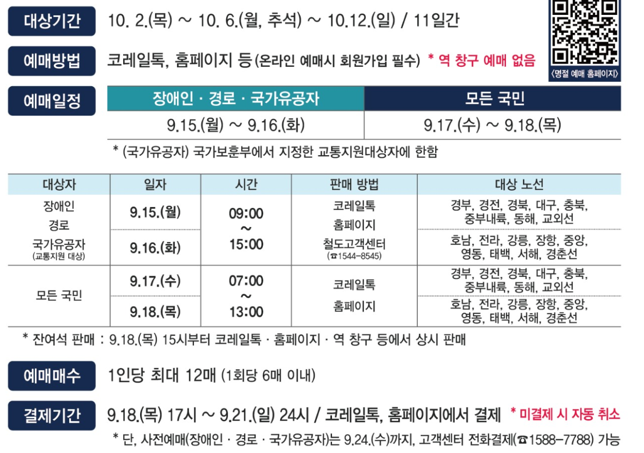 예매 결제 마감: 일반 예매 승차권은 9월 7일 밤 12시까지 결제해야 하며, 결제하지 않으면 자동 취소됩니다.