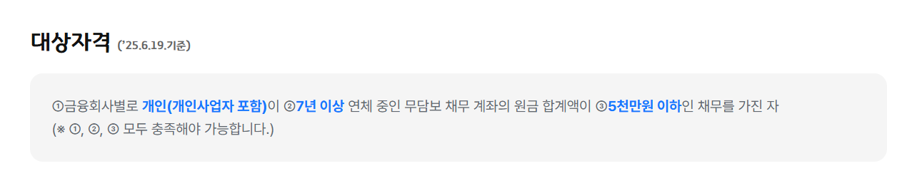 핵심 요건은 크게 세 가지예요. 첫째, 연체 기간 7년 이상. 둘째, 원금 기준 5천만 원 이하(금융회사별 합산 원금, 연체이자 제외). 셋째, 상환능력 심사를 통해 사실상 상환이 불가능하다고 판단되는 경우 채무 소각까지 가능해요. 사행성·유흥업 관련 채무나 외국인 채무 등은 지원 대상에서 제외될 수 있어요.