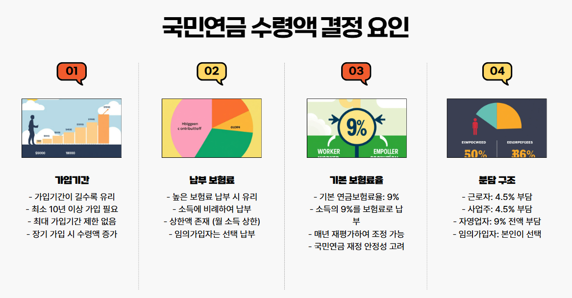 국민연금은 가입기간과 납부한 보험료에 따라 차이가 있습니다. 가입기간이 길수록, 납부한 보험료가 많을수록 연금액이 늘어나죠. 기본 연금보험료율은 **9%**이며, 이는 근로자와 사업주가 반반씩 부담하는 구조입니다.