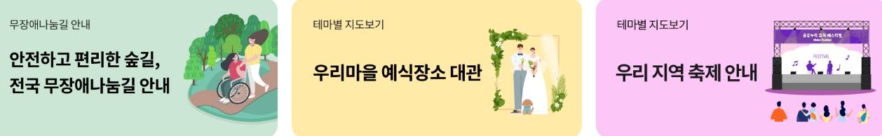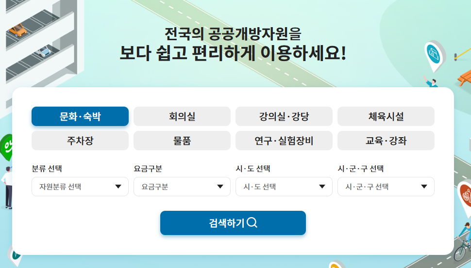 서울, 부산, 대전, 대구, 광주 등 전국의 공공자원을 한 곳에서 검색할 수 있어 지역에 상관없이 편리하게 이용할 수 있습니다.