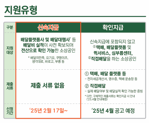 소상공인은 배달·택배 실적이 있으면 누구나 신청 가능하며, 증빙자료가 없는 경우에도 올해까지 실적을 폭넓게 인정받을 수 있습니다. 이번 지원사업은 소상공인의 경제적 부담 완화를 목적으로 시행되며, 신청자 유형에 따라 신속지급과 확인지급으로 나누어 진행됩니다.