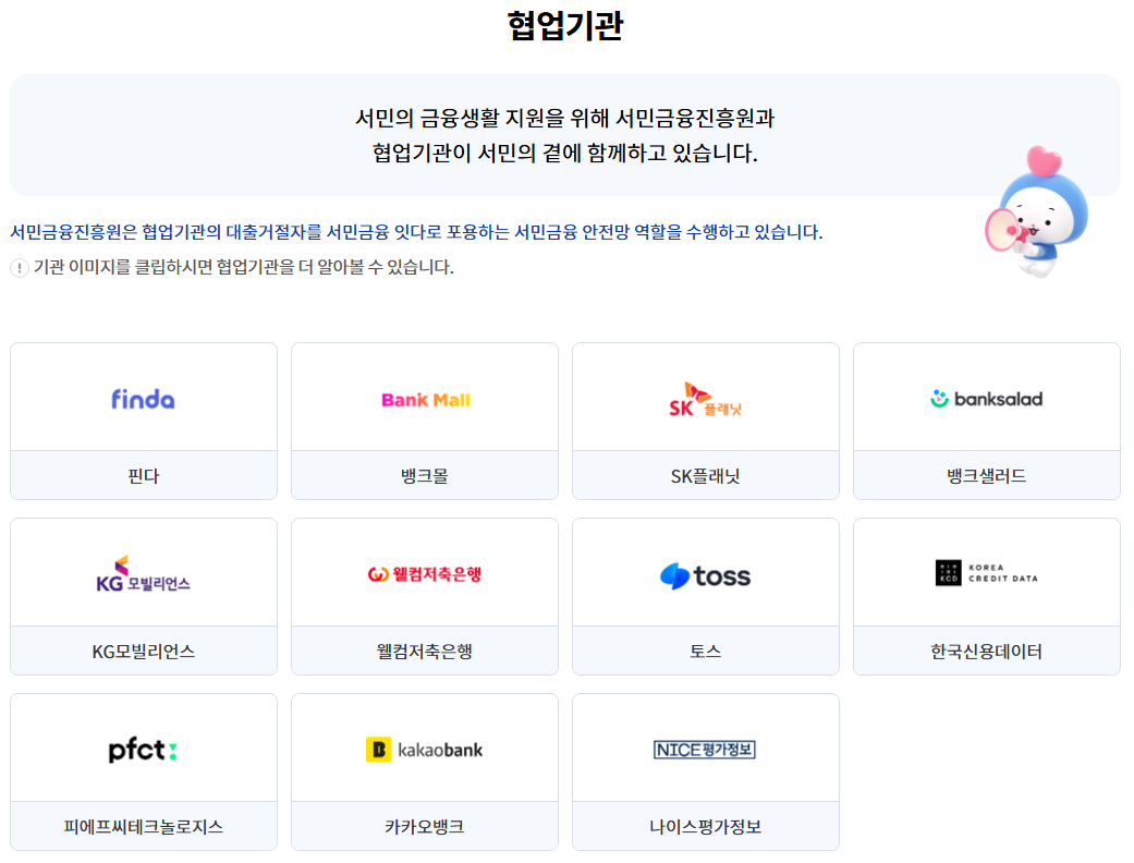 👉 서민금융진흥원의 정책서민금융상품 및 일부 민간 금융기관의 지원 상품을 제공합니다.