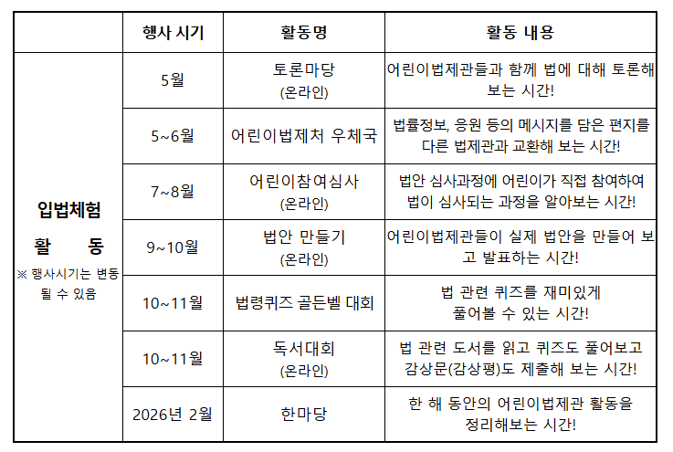 - 토론마당, 법 기관 탐방 등의 입법체험활동 참여