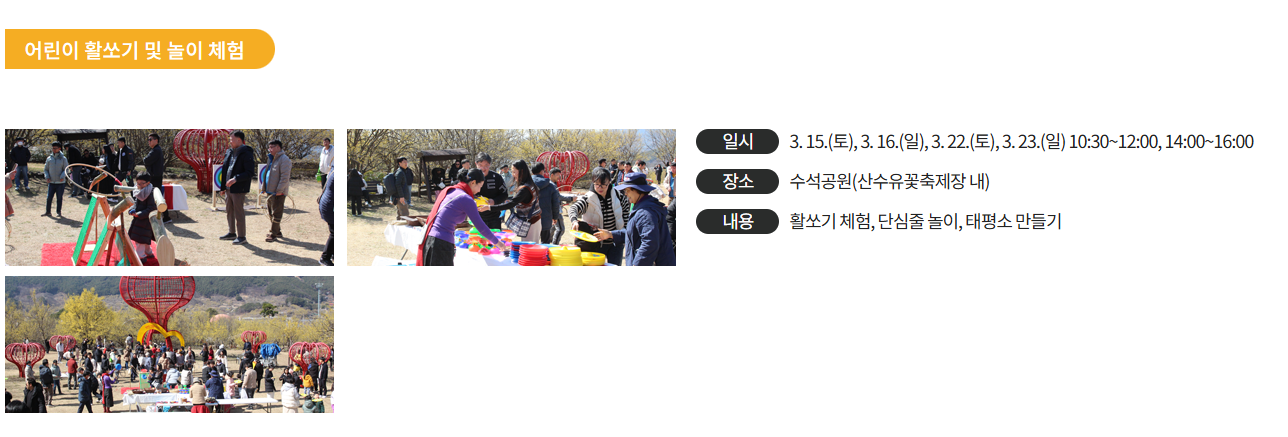 구례산수유꽃축제는 단순한 꽃구경을 넘어 전통문화 체험, 공연, 먹거리 체험 등 다양한 프로그램이 마련되어 있습니다.
